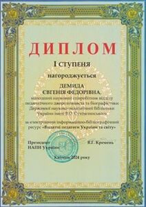 - Березівська Л. Д. Про наукову і науково-організаційну діяльність Державної науково-педагогічної бібліотеки України імені В. О. Сухомлинського за 2020–2024 рр. та перспективи її подальшого розвитку: за результатами наук. доп. на засід. Президії НАПН України, 19 верес. 2024 р. Вісник Національної академії педагогічних наук України. 2024. Т. 6, № 2. С. 1–8 (розд. паг.). DOI: https://doi.org/10.37472/v.naes.2024.6211.