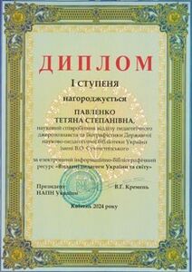 - Berezivska L. D., Pinchuk O. P., Varaksina N. V. The webportal of V. O. Sukhomlynsky State Scientific and Pedagogical Library of Ukraine as an information resource for implementation of research in education, pedagogy and psychology. Information Technologies and Learning Tools. 2020. Vol. 78, No. 4. С. 249–265. DOI: https://doi.org/10.33407/itlt.v78i4.4055.
