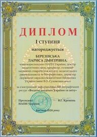 5. Березівська Л. Д. Про наукову і науково-організаційну діяльність Державної науково-педагогічної бібліотеки України імені В. О. Сухомлинського за 2020–2024 рр. та перспективи її подальшого розвитку: за результатами наук. доп. на засід. Президії НАПН України, 19 верес. 2024 р. Вісник Національної академії педагогічних наук України. 2024. Т. 6, № 2. С. 1–8 (розд. паг.). DOI: https://doi.org/10.37472/v.naes.2024.6211.